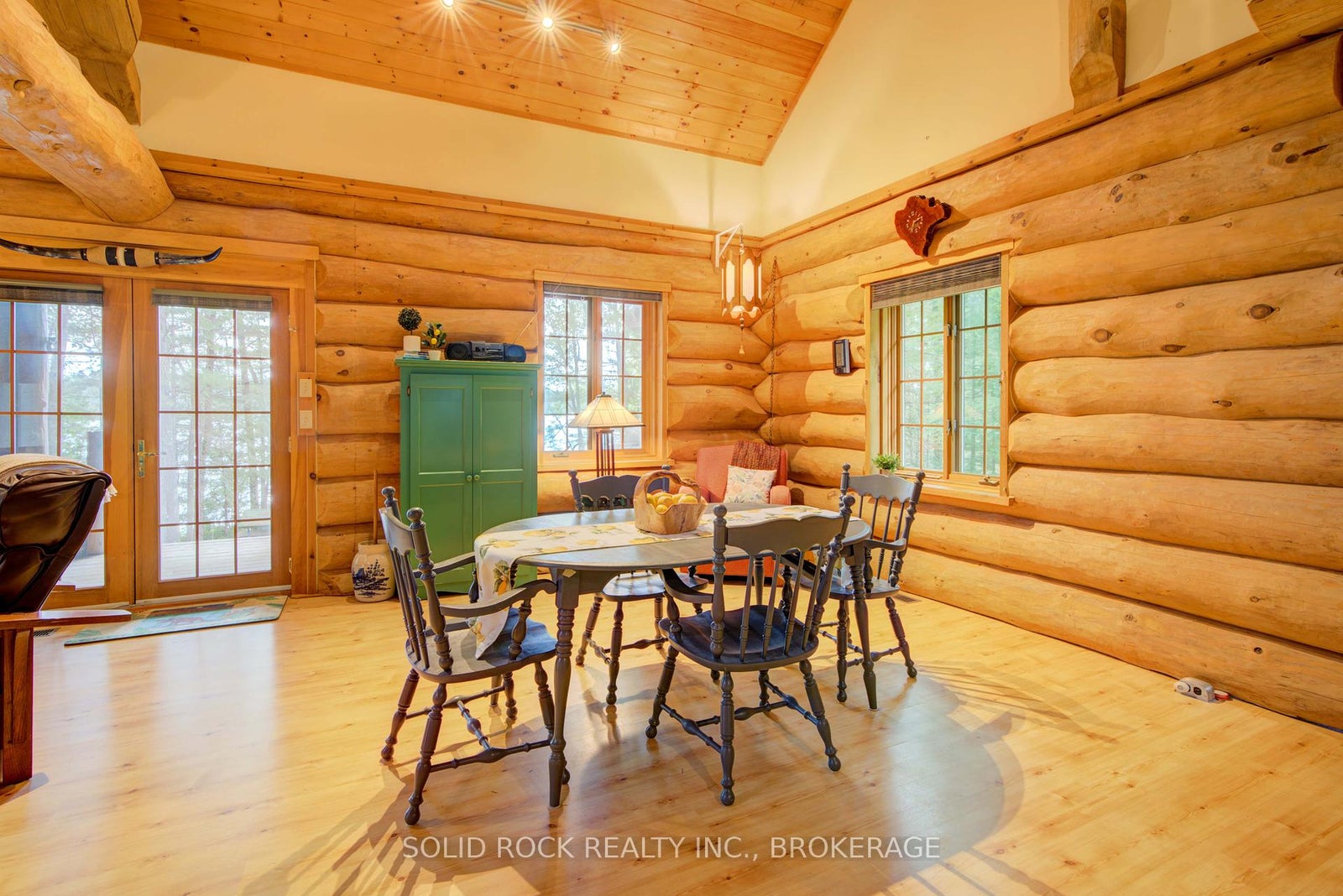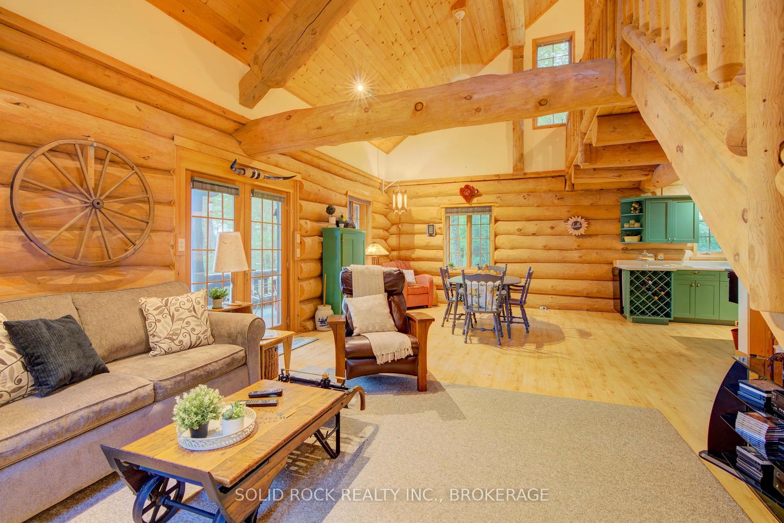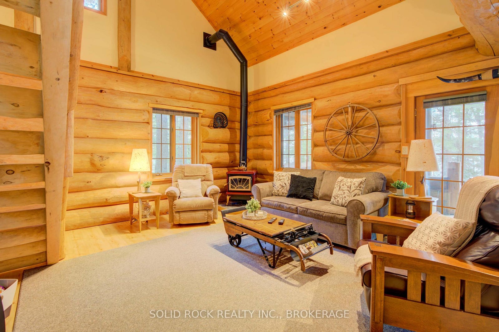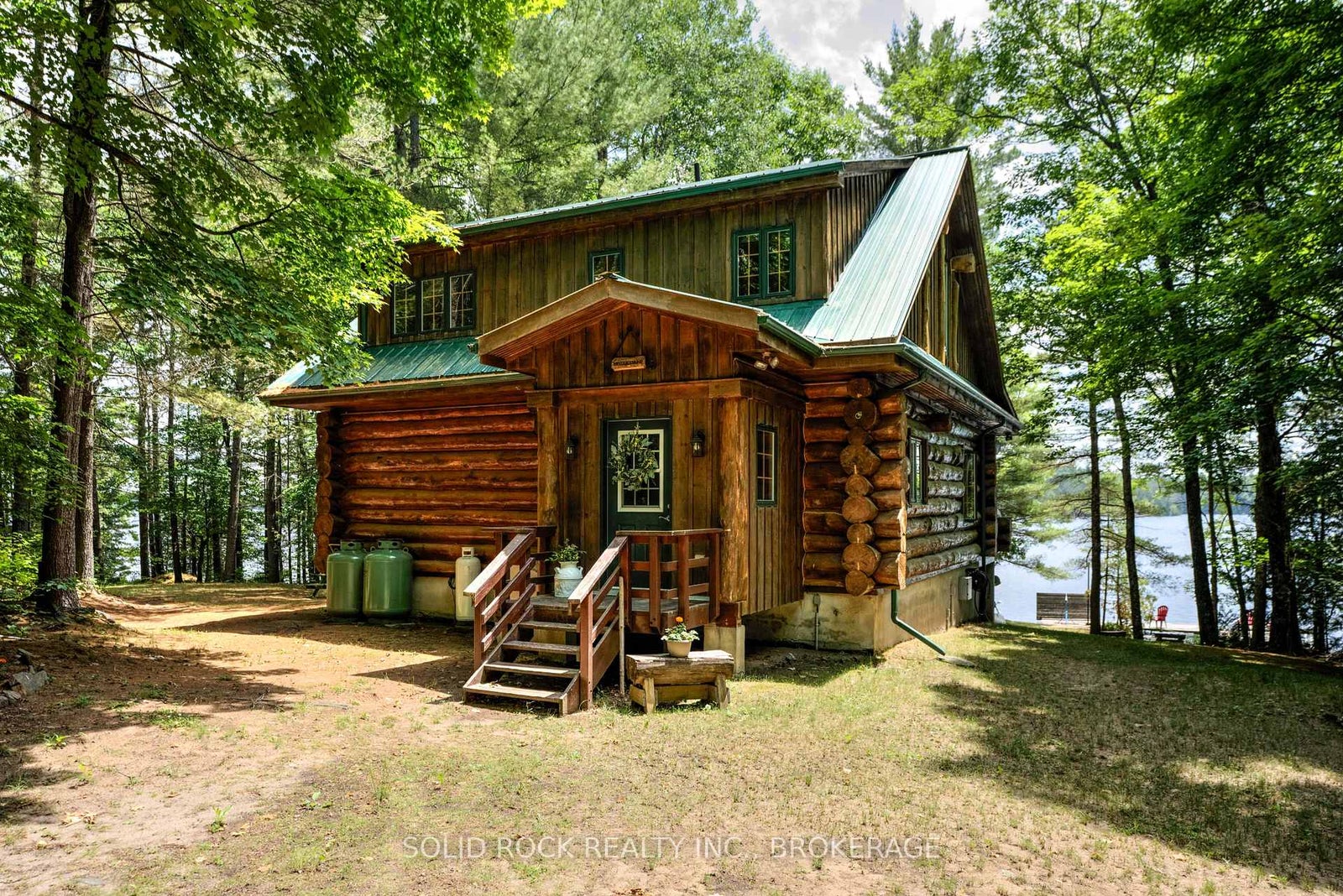 Welcome to your dream getaway on the tranquil shores of beautiful, clean, Big Gull Lake. This meticulously crafted 3-bedroom, 2 full bathroom, full scribe, pine log/board & batten, winterized home, (with a metal roof) built in 1999, sits on a private 1.49-acre lot with over 200 feet of natural shoreline, offering peace, privacy and endless waterfront enjoyment. The one of a kind home features warm wood finishes (nine logs high then its drywall ) with an inviting open-concept layout, large windows that invite the natural light in and breathtaking views of the Lake. The main living space is perfect for relaxing or entertaining with the primary bedroom and main floor bathroom located right off the family room. The modern kitchen adds a " punch of the past" with the old fashion look of the cast iron wood burning stove, but with the modern convenience of electricity! Climb the custom built log stairs to the 2 bedrooms and second full bathroom- all overlooking the main floor with a view of the incredible architecture of the interior of the home. The lower level is reached by outside entry at the bottom level - this is where you will find the laundry area, utility room and additional storage. There is a detached, double car garage/workshop (with a metal roof) equipped with 200 amp service, ideal for storing toys, tackling projects, or creating a hobby space. Phenomenal fishing of northern pike, walleye and largemouth bass. Whether you're boating, swimming, or simply soaking in the quiet from your deck, every part of this property is designed for lakeside living at its best. This is more than just a cottage, it's a lifestyle. Whether you're looking for a year-round home or a seasonal escape, this Big Gull Lake gem is ready to welcome you. Don't miss the opportunity to own your own piece of paradise! Located 3.5hrs east of Toronto, 2.5hrs West of Ottawa & 2hrs north of Kingston. PLEASE NOTE: fire/civic address is 2091 Gull Lake Estates Lane.